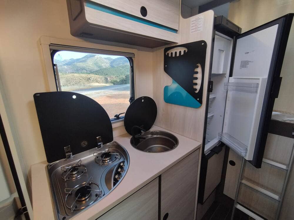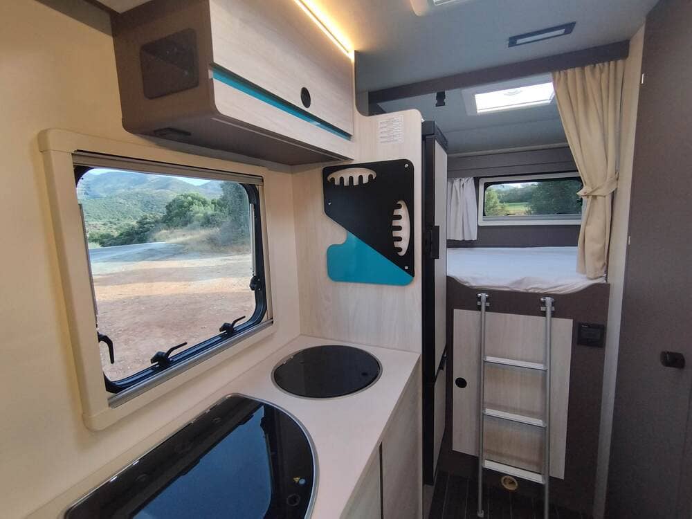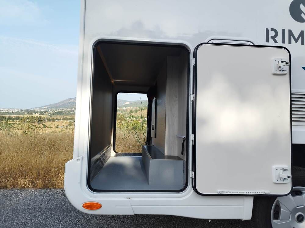 La autocaravana Rimor Kilig 18 es una perfilada corta con una longitud de sólo 6 metros. El salón es ofrece espacio incluso para 4 personas, es muy luminoso gracias a las ventanas y claraboyas. El baño está integrado en el lateral, al igual que la cocina con un gran frigorífico. En la corta longitud hay incluso espacio para un garaje con capacidad para dos bicicletas, cochecitos o equipos de kite o windsurf.